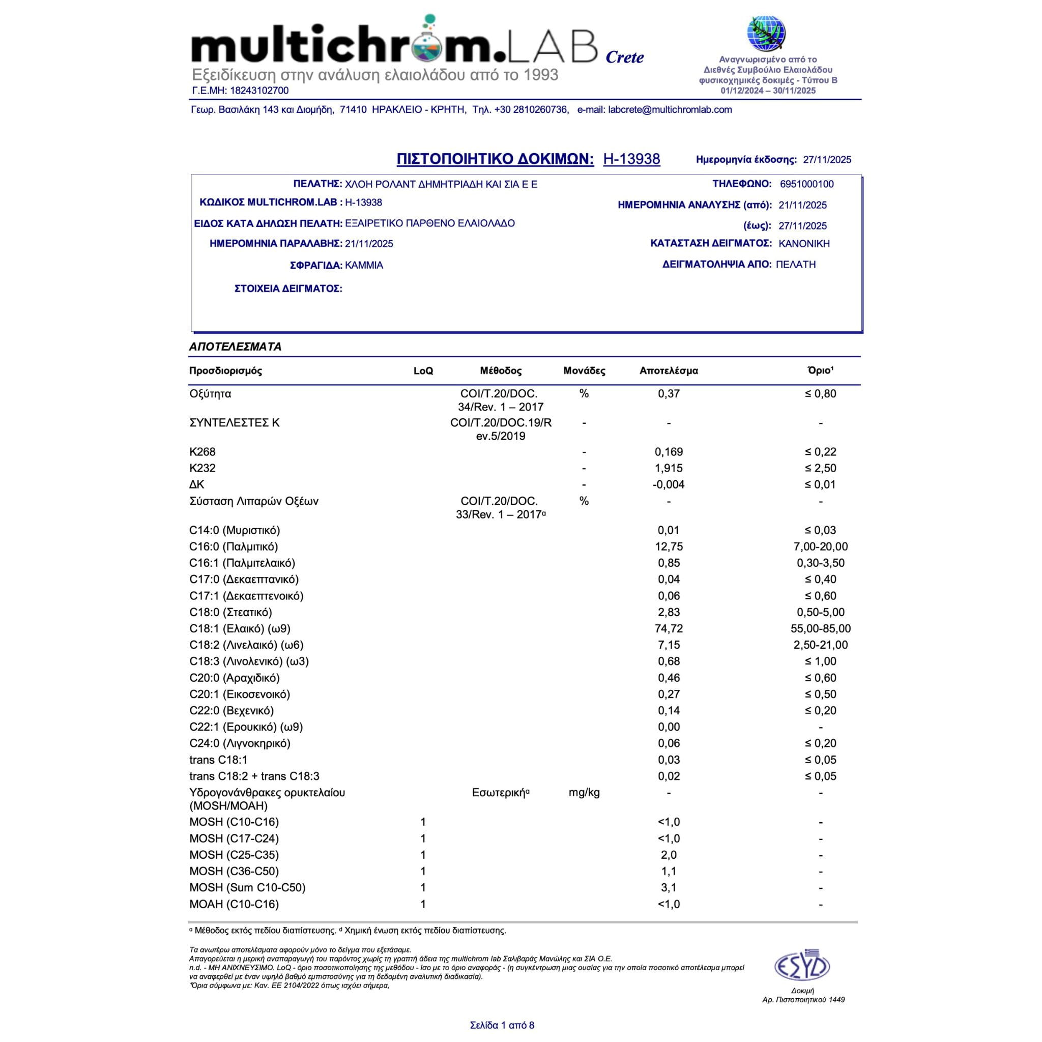 The current physicochemical analysis also confirms its excellent quality parameters: K232: 1.915, K268: 0.169, ΔK: −0.004. The report shows no detectable pesticide residues (n.d. at LoQ 0.01 mg/kg) and very low levels of MOSH/MOAH fractions (including MOAH sum C10–C50 <1.0 mg/kg).