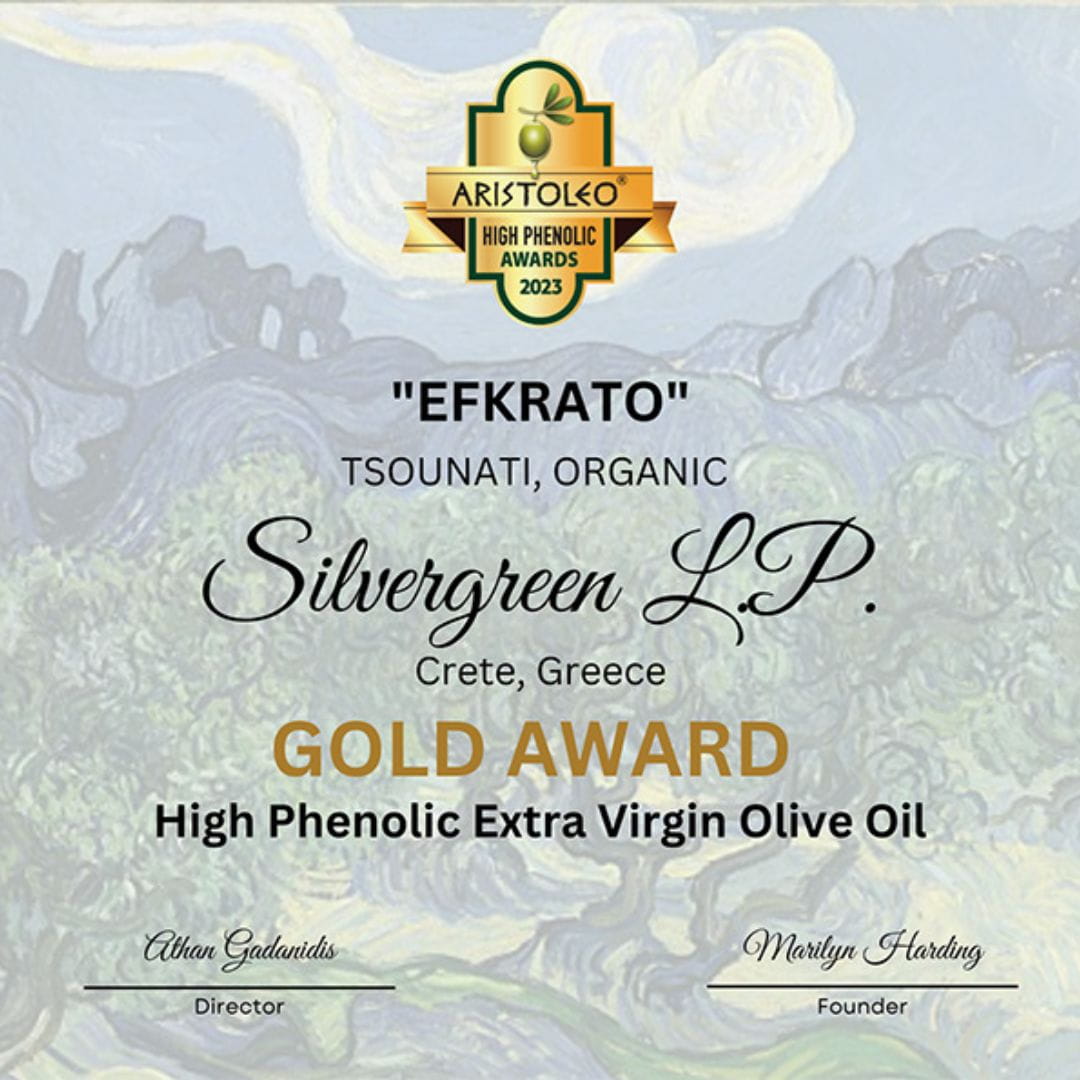 - 2020: Gourmet (Fruitée Verte) at ΑVPA Paris, Silver (Quality Organic) at BERLIN GOOA, Gold at OLYMPIA Health & Nutrition Awards, Silver at ATHENA IOOC, Gold at ARISTOLEO Awards, Bronze at LONDON IOOC (Health Claim and Quality), Honorary Distinction at Cretan Olive Oil Competition (Bio), Gold at DUBAI IOOC