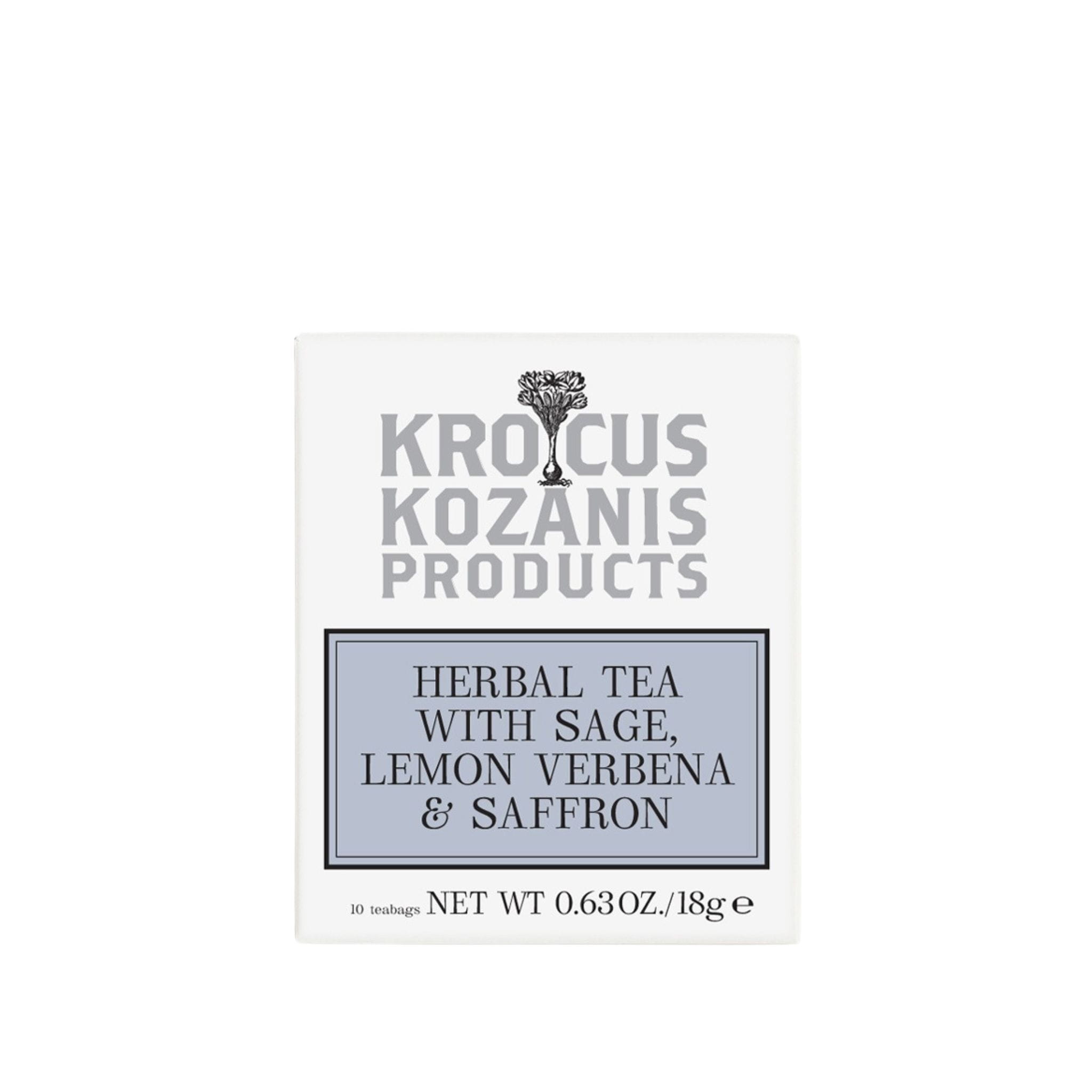 - Herbal tea with sage, lemon verbena and saffron – a herbal blend of mountain herbs with a delicate hint of verbena. Ingredients: herbal blend (rooibos, sage 14.8%, peppermint, lemon verbena 9.9%, lemon balm, lemongrass, fennel, aniseed, thyme, rosemary), Krokos Kozanis PDO saffron 1.1%. Gluten-free, caffeine-free.