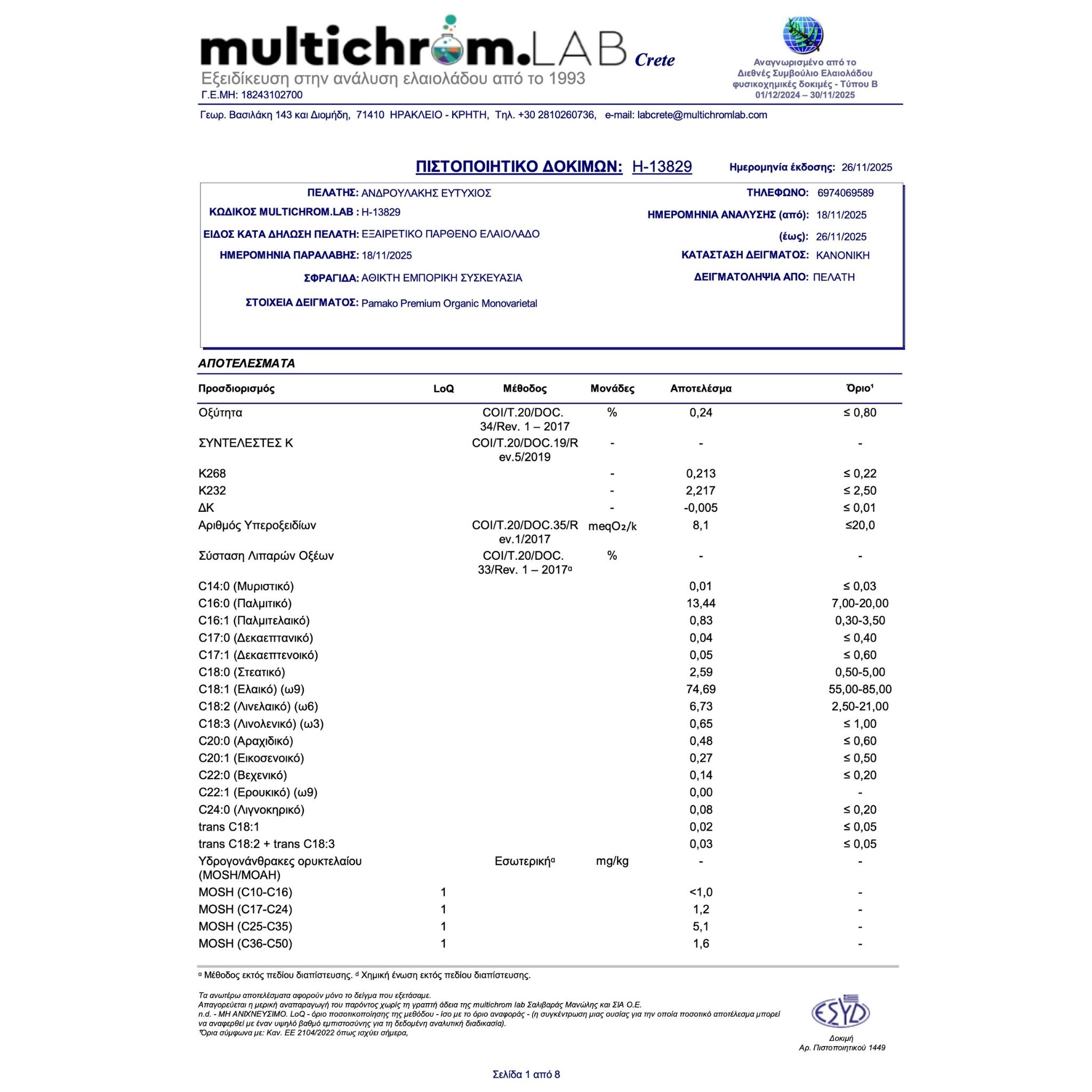 Pamako early harvest extra virgin ultra premium Tsounati Monovarietal olive oil 250ml ORGANIC (NMR: Total 2081 mg/kg, Index D1 1582 mg/kg)