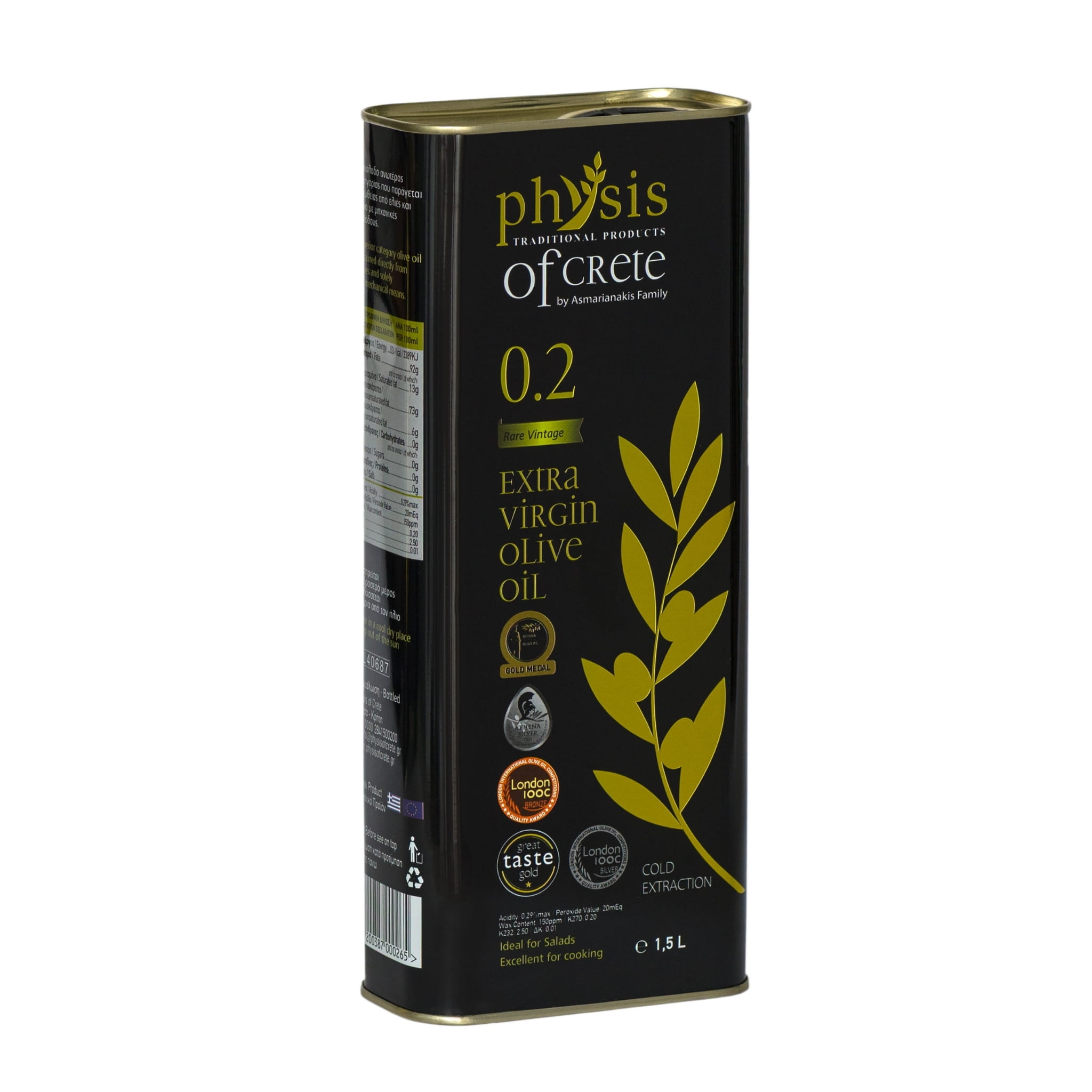 Physis of Crete 0.2, which has an acidity of less than 0.29%, indicates the exceptional purity of the product (extra virgin olive oil, considered to be of the highest quality, must have an acidity of less than 0.8%), but its delicate flavour and rich aroma are the result of a perfect combination of all the key characteristics of olive oil, not just acidity.