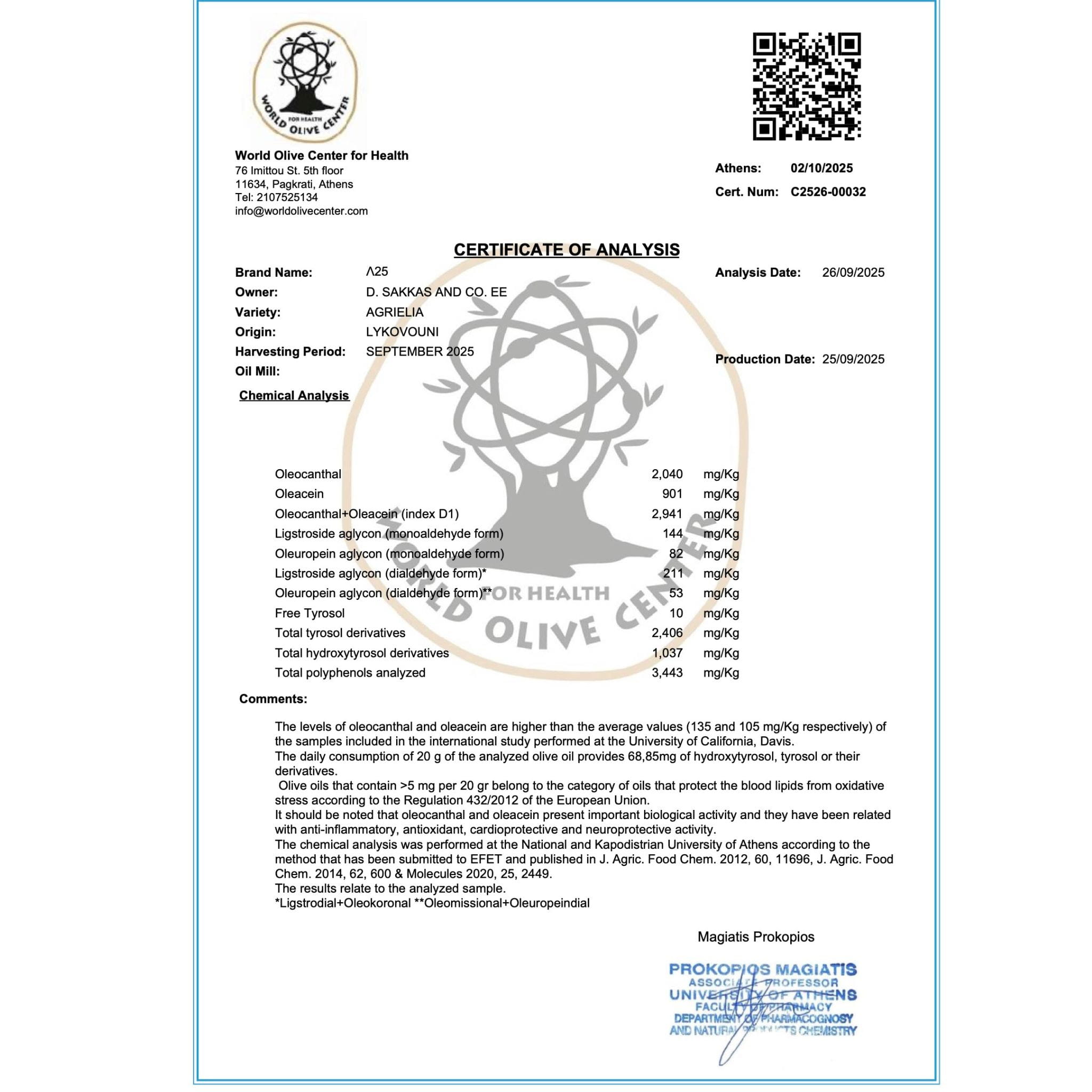 - World Olive Centre for Health: certificate C2526-00032 (02.10.2025)